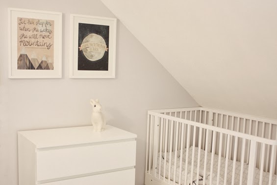 Liten skrutt har ett rum med mycket golvyta som bjuder in till lek men samtidigt en hel del snedtak. Det är inte mycket som räknas till bostadsyta i rummet trots många kvadratmeter golv... Taket gör rummet oerhört svårmöblerat och trots otaliga ommöbleringar så får jag inte riktigt till det... Efter mycket om och men har sängen fått flytta in under snedtaket på ena sidan av rummet, inte så feng shui, men hur jag än vrider och vänder på den så tycker jag inte den passar någon annanstans! Sängen stod tidigare under tavlorna som ni ser i bild här ovanför men istället placerades en byrå där under och finaste nattlampan i form av en kanin fick därmed en given plats! Byrån sväljer de få leksaker som vår lilla skrutt har.